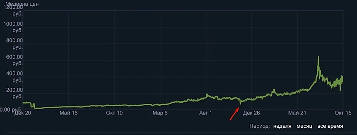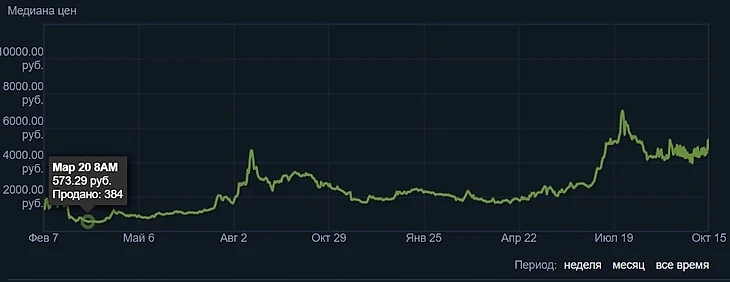 Сейчас наклейка стоит 4100 рублей – отличное время прикупить пару штук. Текущий спад цен вызван перенасыщением рынка, произошедшим из-за появления большого количества новых трейдеров и популяризацией темы – многие ютуберы подробно рассказывают о таком методе заработка. Ситуация должна разрешиться на осенней распродаже, когда крупные инвесторы начнут скупать наклейки и скины в больших количествах.