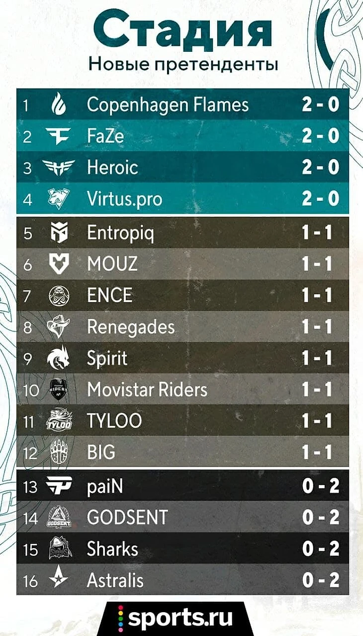 • Virtus.pro – единственная СНГ-команда, закончившая день со счетом 2 – 0. Она обыграла Pain и Movistar Riders. Spirit и Entropiq идут со счетом 1 – 1.