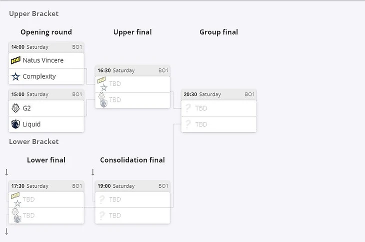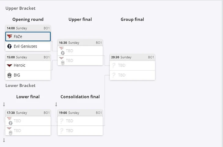 Матчи первого этапа играются в формате bo1, все остальные – bo3.
