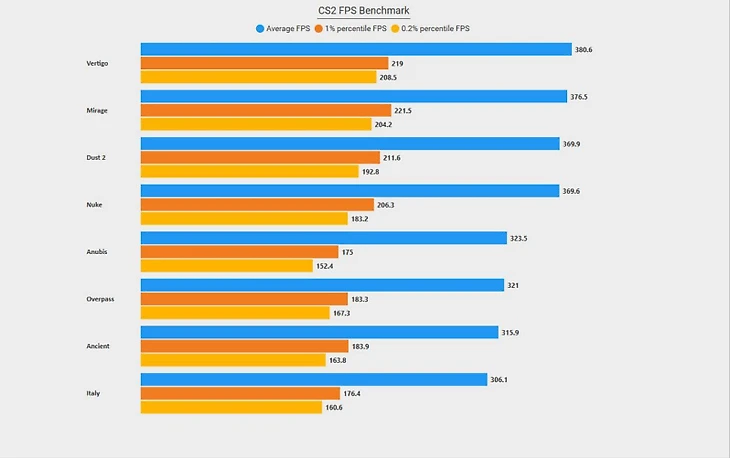 Dust 2 и Nuke получили больше изменений, что отразилось на кадровой частоте. Обе карты идут со средним значением 369 FPS и с просадками до 200 FPS.