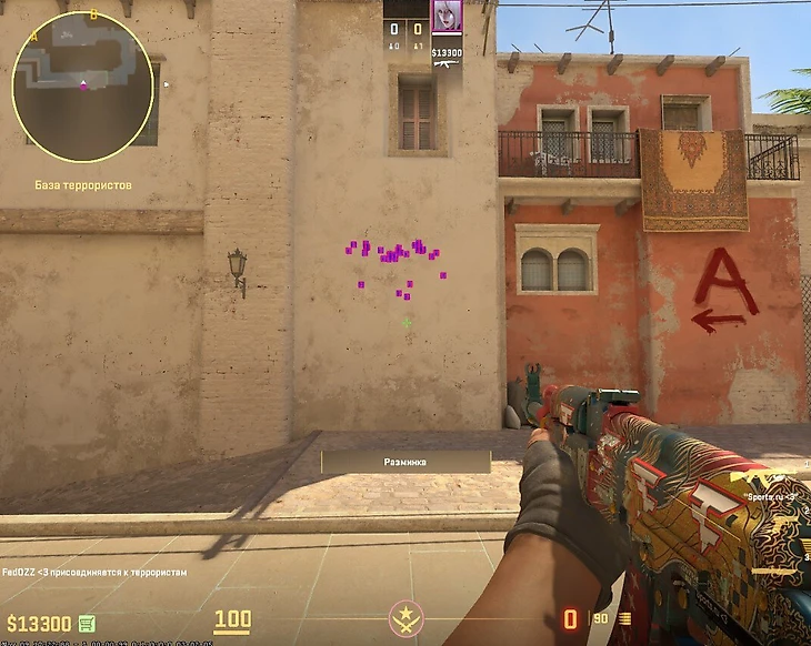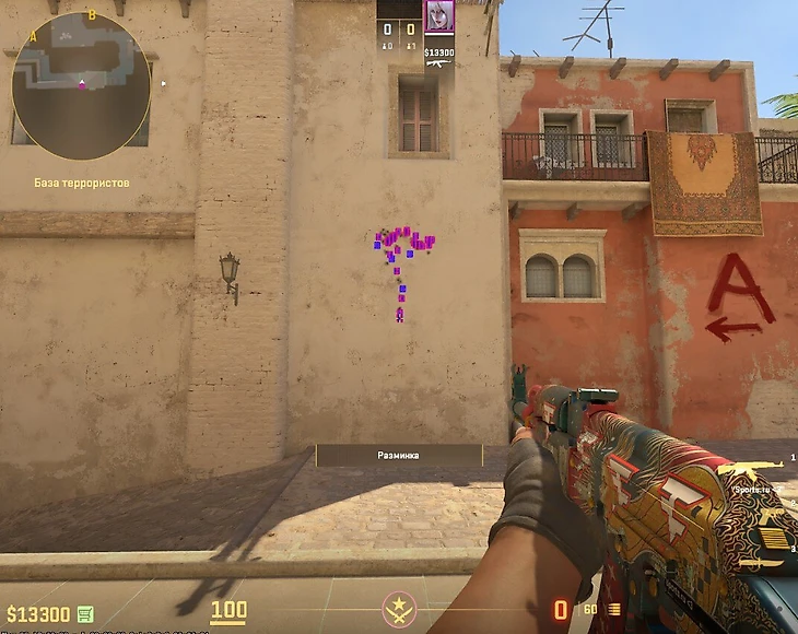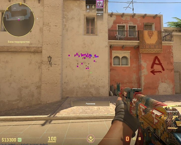 Замечаем минимальную разницу, которую можно списать на погрешность, – все-таки повторить движение мышкой один в один невозможно. Но обращаем внимание на фиолетовые точки на стене – они отвечают за регистрацию на сервере (розовые – выстрелы на стороне клиента). На первых двух скриншотах они идеально совпадают, на последних двух – отличаются.