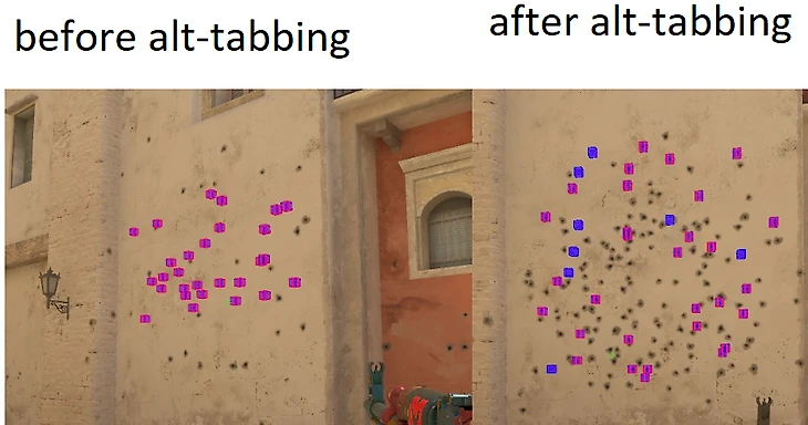 На реддите провели дополнительные тесты. После альт-таба, действительно, есть разница между розовыми и фиолетовыми точками – первые появляются намного реже. Но никакой рассинхронизации: серверные точки остаются в месте выстрела так же, как и следы на стене.