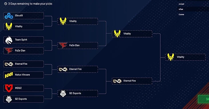 В стадиях Opening и Elimination необходимо сделать 5 правильных прогнозов из 10. Игроки должны угадать две команды, которые вылетят без побед; две, которые пройдут без поражений, и еще 6 команд, которые выйдут в следующую стадию.