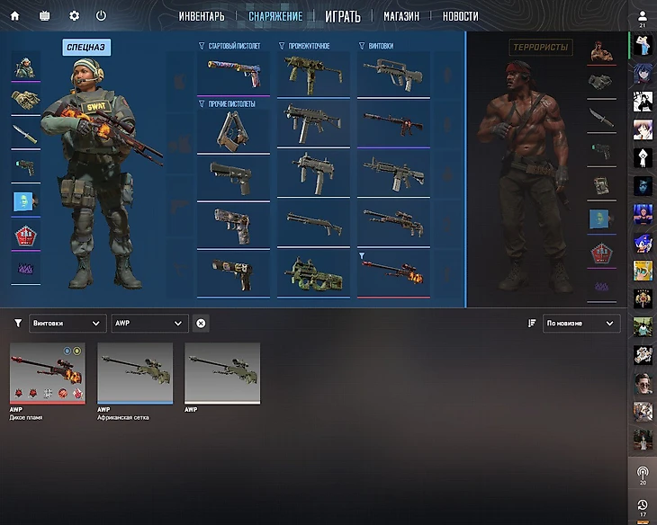 Чтобы поменять оружие в лобби, перейдите на вкладку «Снаряжение». Вам доступно 4 слота для пистолетов, по 5 для переходных девайсов и винтовок. Если вы нажмете на пушку, то сможете выбрать на нее любой скин из вашего инвентаря. В нижней панели вы можете выбрать девайс с помощью фильтров по типу оружия и конкретной модели. Перенесите его из общего списка в нужный слот. Обратите внимание: менять пушки во время соревновательного матча невозможно.