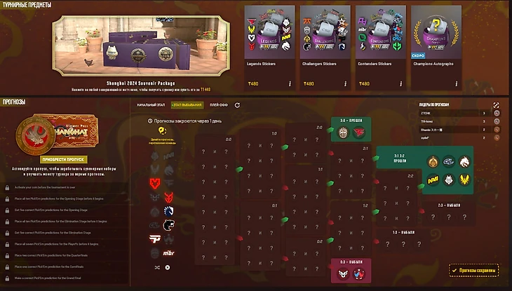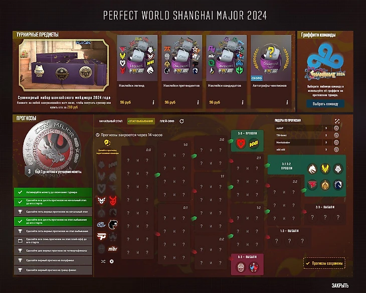 На мейджорах Valve запускает боевой пропуск, с помощью которого можно получить сувенирные наборы и медали. В основном, он строится вокруг Pick’Em Challenge – задания, где игроки должны предсказать команды, которые пройдут в следующую стадию турнира или выиграют в матчах плей-офф. За это он получает токены, которые обменивает на кейсы.