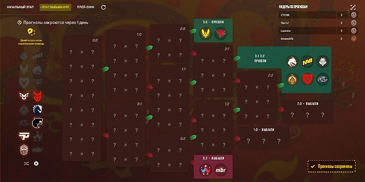 В стадиях Opening и Elimination необходимо сделать 5 верных прогнозов из 10. Каждый игрок выбирает по две команды, которые закончат со счетом 3-0 и и 0-3 и 6 команд, которые пройдут в следующую стадию.