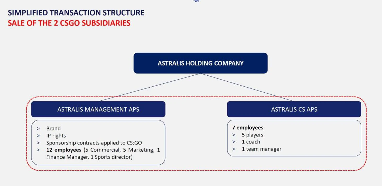 Организации все еще принадлежит компьютерный клуб Astralis Nexus в Копенгагене и доли в двух датских медиакомпаниях. Неизвестно войдут ли они в сделку по продаже CS-состава и менеджмента.