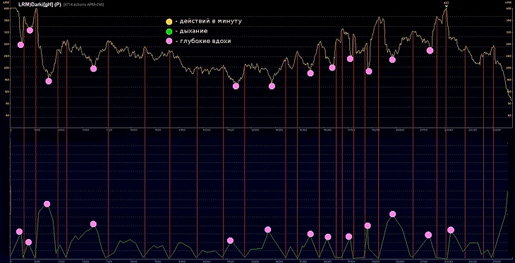 Блокировка дыхания - Для полноценного эксперимента в «лабораторных условиях» потребуется спирограф и импортная, коммерческая компьютерная программа StarCraft2, т.к. стратегии в реальном времени наиболее требовательны как к точности попадания курсором, так и к количеству точных нажатий в минуту. Следовательно позволяют наиболее надёжно получить интересующие нас данные. Конкретно — график действий в минуту (apm). Спирограмма, фиксируемая в течении всей схватки, должна быть точно по времени наложена на график действий, совершаемых игроком в минуту (apm).