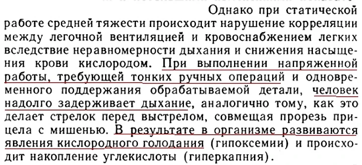 Компенсация вышеописанного фактора всегда осуществляется рефлекторной остановкой дыхания ради точности осуществления мелкомоторных операций.