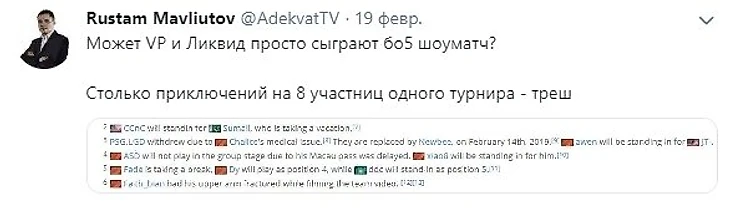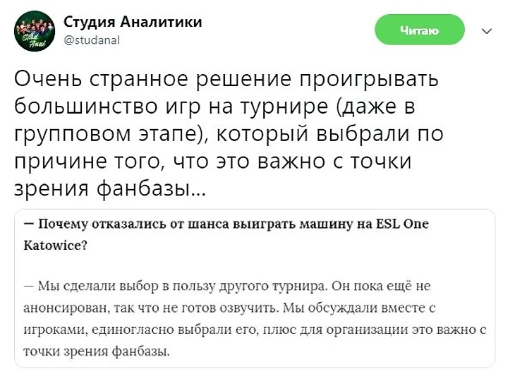 Твиттер Студанала назвал странным исполнение на турнире, который VP выбрали вместо ESL с точки зрения фанбазы.