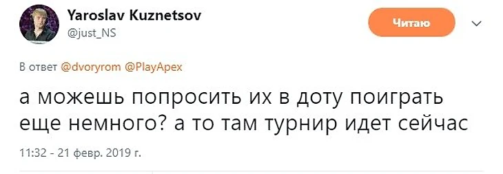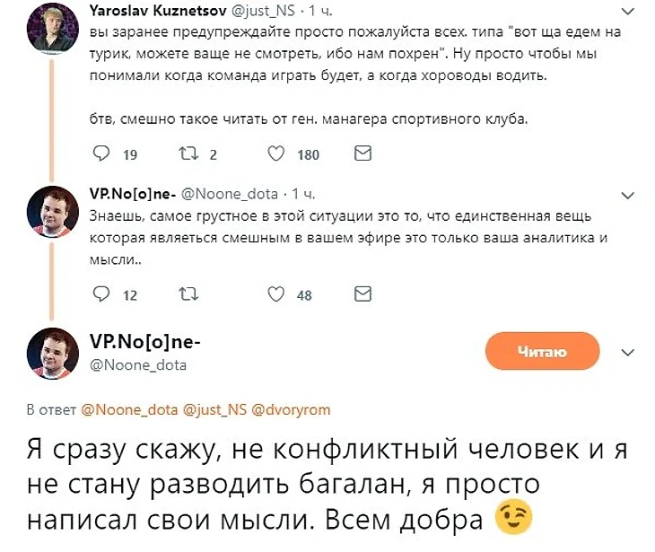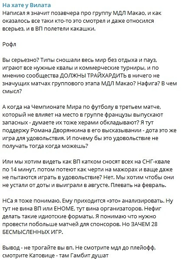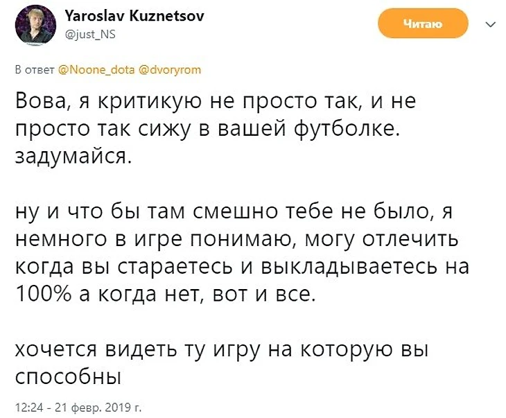 «Я с уважением отношусь к Ярославу, но это высказывание показывает, что ему лучше концентрироваться на своих основных обязанностях. Объясню свою точку зрения. Прошлый год показал, что мы в состоянии выиграть по сути любой турнир регулярного сезона DPC, мы могли не отдать ни одной карты, даже победить с заменой. Это было здорово, но в начале этого сезона мы изначально обозначили совершенно другую цель – отобраться на TI и спокойно и планомерно готовиться к главному турниру года. Обратите внимание на то, как отличаются наши выступления на мейджорах (1 и 2 место) и турнирах вне рейтинга DPC.