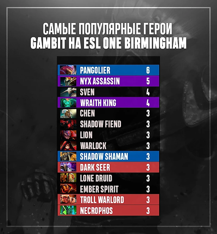Вот список героев, которых Gambit брали от 3 до 6 раз: