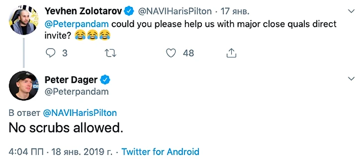 Помните спор вокруг инвайтов на квалификации в январе? Тогда приглашение досталось Паваге, а не NaVi. CEO организации Евгений Золотарев в шутку попросил помощи у Ppd, который до этого помог решить проблему Веге. Но Ppd ответил достаточно жестко:
