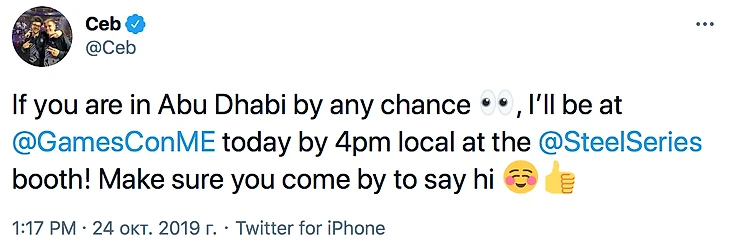 23 октября я в первый раз в своей жизни посетил ОАЭ. Свой отпуск я решил провести там по случаю проведения концерта одного хип-хоп исполнителя. Все было рассчитано за 5 месяцев вперед примерно в начале июня. 24 октября примерно после 12:00 местного времени вернувшись в свой номер гостиницы, я открыл проверить новостную ленту твиттера. Прочитав твит Себа о том что сейчас он находится Абу-Даби и через несколько часов он планирует провести встречу с фанатами и просто людьми которым дота небезразлична. Встреча проводилась по случаю рекламной акции Steelseries, чьим амбассадором он и является.