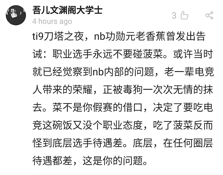 На TI9, ветеран Newbee предупреждал никогда не играть подставные матчи. Возможно, проблемы были уже в то время. Старое поколение игроков принесло славу, которую стерли эти псы. Голод – не повод играть подставные матчи. Вы должны были питаться одним рисом и оставаться профессионалами, а не жаловаться на маленькую оплату. Маленькая оплата – только ваша вина.