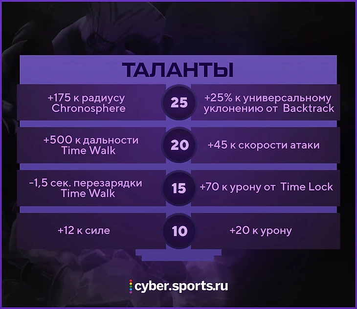 Теперь о талантах. Многие в пабликах берут +15 урона на десятом: не надо так. Статистика и про-сцена говорят о том, что талант на здоровье куда сильнее. На пятнадцатом берем +урон к Time Lock, без вариантов. Двадцатый и двадцать пятый уровни имеют оба неплохих таланта, но я рекомендую брать радиус Time Walk и 25% Backtrack. Бэктрэк позволяет избежать любого урона, даже ульты Лины.