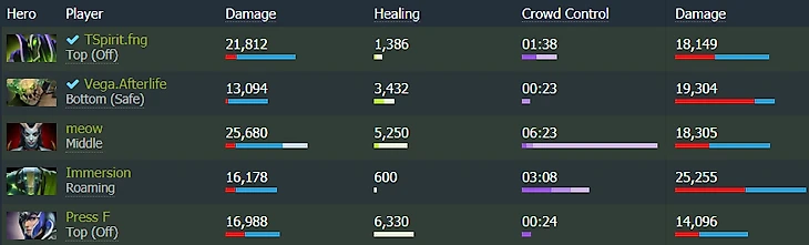 Не менее показательна и статистика полученного урона. Его у Луны меньше всех, что непозволительно в нынешней мете, где один из двух кор-героев должен жить до последнего. Не Квопе же танковать, верно? Вот и получается, что в той самой решающей драке на Рошане Daxak не мог подойти к героям врага без BKB (это вообще отдельный вопрос, почему он проигнорировал этот артефакт), и не мог нанести урон с руки – 180 единиц атаки против щита Свена и промахов с Radiance – это равносильно убийству чайной ложкой.