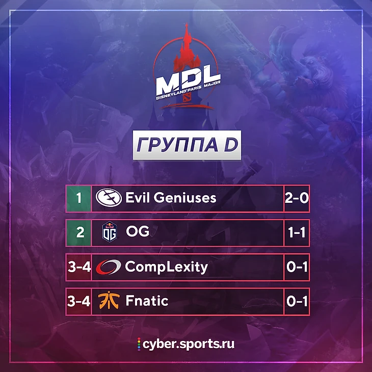 21:30 OG 2–0 Complexity. Второй невероятной победе CoL за день не случилось – сначала OG расправилась с оппонентом при помощи расфармленного Антимага, а на второй карте развалила за 25 минут сноуболом с Энигмой и Троллем.