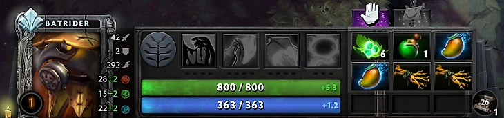 В первую очередь Нета позаботился о скорости передвижения, купив Wind Lace и Boots of Speed. Затем настало время становится плотным – благодаря Брейсеру и барабанам у Бэтрайдера было 1400 здоровья к десятой минуте.