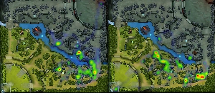 При этом Алхимику оставили фрифарм. Сейчас Алхимика повсеместно закрывают Найксом, и VP сделала правильный драфт. Но параллельно Алхимику мешают любыми методами – с этим у нашей команды были трудности. Lifestealer не выгоняет Алхимика под Шадоу Демоном, а Solo приходилось уходить с линии, о чем говорят их тепловые карты.