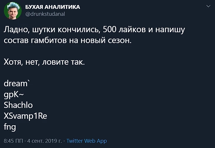 08:35. Lgdamefan (инсайдер с реддита, который предсказывал переходы игроков в 2017 и 2018 годах) заявил, что один из игроков VP будет играть в Evil Geniuses. Странно, что он сразу не назвал человека, на которого сейчас думают абсолютно все.