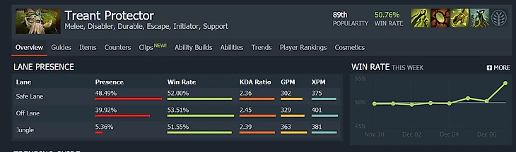И Valve прислушалась к чемпиону TI! Теперь Трент с первого уровня может ходить сквозь деревья, а с десятого – еще и в невидимости. Только зачем Valve так резко подняла героя с 50% побед и пиками на просцене? Сейчас у защитника лесов уже 54%, и значение лишь растет.
