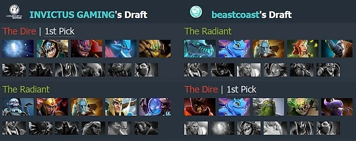 Первые три минуты драфта на первой карте казалось, что Beastcoast на шаг впереди – отдали Сларка и Виспа (до этого банили их в первой стадии против любого соперника) и закрыли комбинацией Puck-Winter Wyvern, но потом IG три пика подряд идеально отвечали на задумки BC.