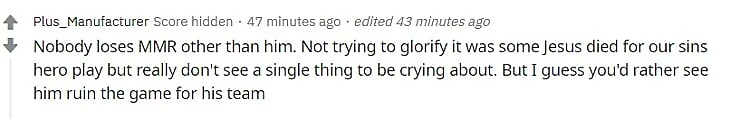 На Реддите никто не порицал Питера за поступок из-за того, что Ppd покинул игру до первой крови. Это значит, что 30 рейтинга потеряет только он. Критикам Питера доставалось в комментариях: