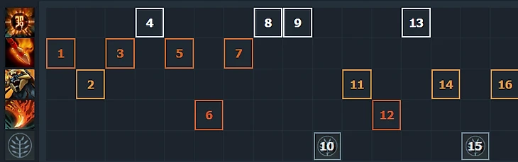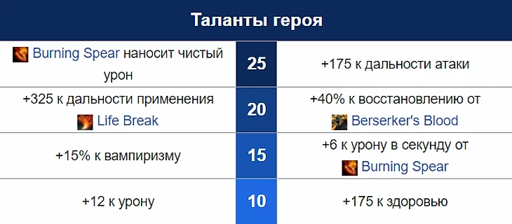 Здоровье на десятом, урон копья на пятнадцатом, дальность применения ульты и чистой урон Burning Spear – тут других вариантов нет.