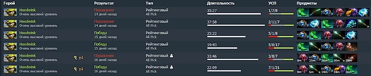 От отчаяния я даже решил потестить Hoodwink, и знаете, что? Осознал, откуда взялась теория 50%. Я сыграл 6 игр на белке с винрейтом 50%: посмотрите на мой KDA в выигранных и проигранных картах.