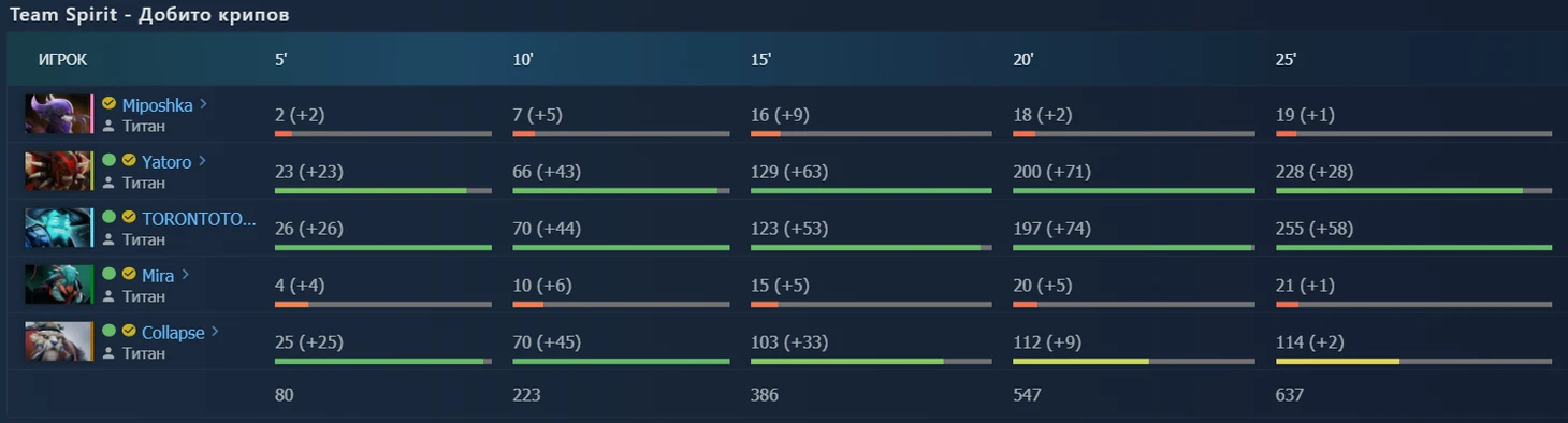 С другой, лучше всего проблему Тускара-кора обозначил Shadowehh: «Как бы он ни душил линию, в один момент герой просто перестает фармить». Открываем графики добитых крипов и видим пропасть между Коллапсом и собственными кор-игроками: