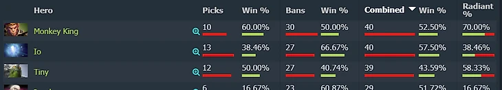 Да-да, речь об Io. В первый день было сыграно 40 карт, и только два героя были выбраны или запрещены в каждом из них – Io и Monkey King. У Tiny 39 появлений, так что его можно смело приписывать к этой парочке.