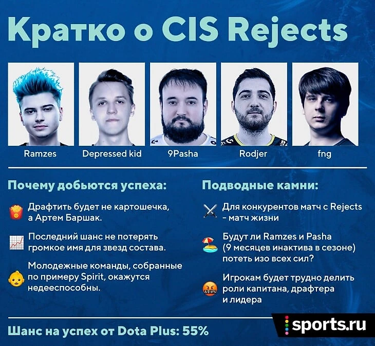 1. Каждый из прямых конкурентов будет выходить на матч с CIS Rejects как на матч жизни. По другому и быть не может, когда вы играете против команды, где море звездных игроков, но звездной силы она пока не показывала. С одной стороны, каждый хочет победить Рамзеса, Роджера и Фнг. С другой, прямо сейчас это не настолько грозные имена, чтобы руки дрожали в одном лобби с ними.