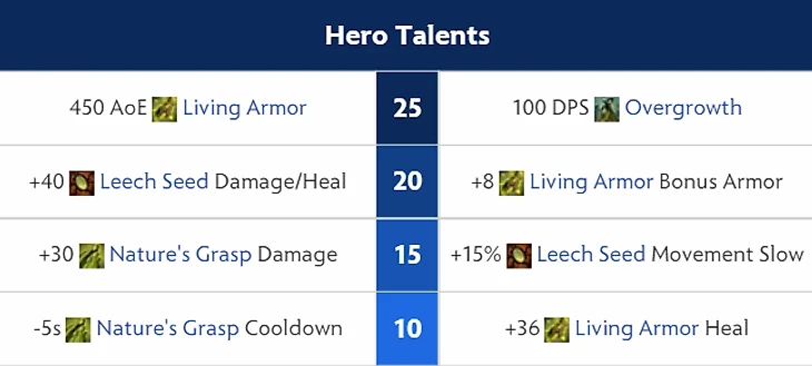 20-й: смотрим по ситуации. Если у оппонента много физического урона – берем +8 к броне Living Armor. В остальных случаях улучшаем Leech Seed и получаем 150 лечения/урона за тик.