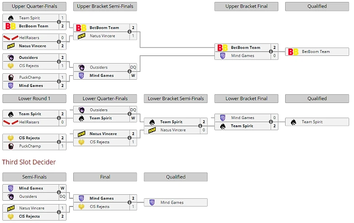 В третью сетку по регламенту должны были попасть все команды, кроме двух проигравших в первом раунде и двух победителей финалов. Но так как Outsiders выгнали с турнира, осталось лишь три претендента – один из них автоматически проходил в финал.