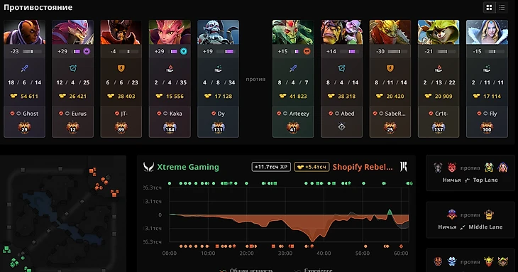 Обратите внимание: преимущество Shopify достигало 20 тысяч золотых, но Xtreme четко была нацелена на лейт.