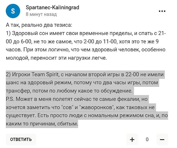 Сегодня менеджер команды Дмитрий «Korb3n» Белов выложил большой пост в своем телеграм-канале, где назвал текст Кибера «говном». Ознакомиться с полной версией его высказывания вы можете по ссылке – там есть мысли не только про нас, но и про будущее Spirit и BetBoom. Здесь же я буду цитировать фрагменты, касающиеся непосредственно истории с текстом и пресловутым режимом сна.