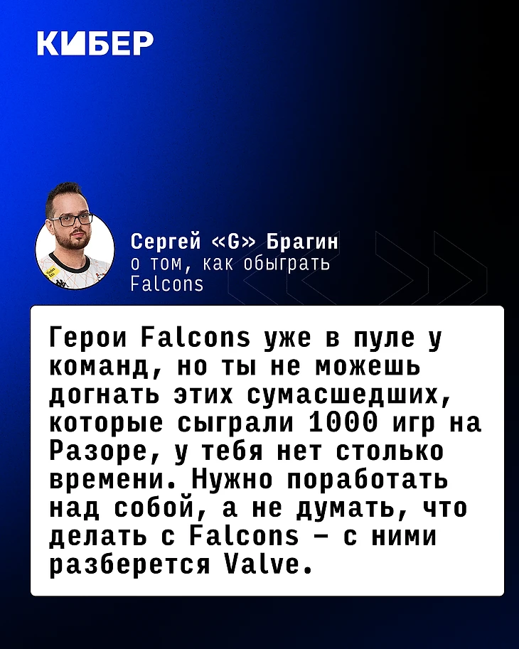 Всем надо step up their game, чтобы ориентироваться в базовых вещах в мидгейме против них. В первую очередь всем нужно поработать над собой, чем думать, что делать с Falcons. Потому что с ними рано или поздно разберется Valve. Если нет, то Falcons и другими героями будут забирать турнир за турниром.