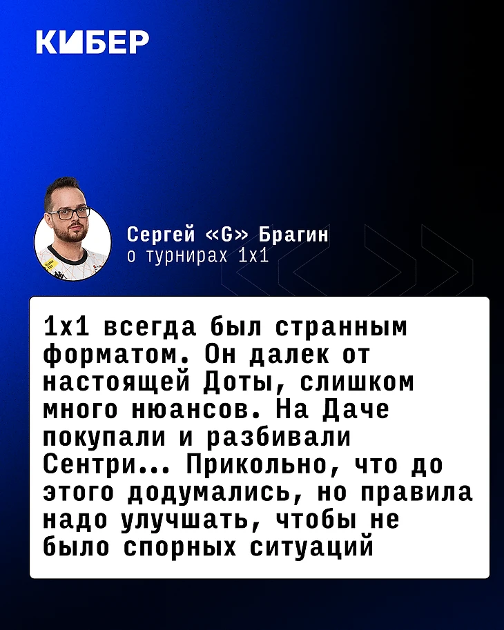 1х1 всегда был странным форматом и никогда не был «тот». Лично мне всегда импонировали турниры на SF, но тоже есть нюансы. Это две разные игры, когда берутся койлы или души на первом уровне. 1х1 далеко от настоящей Доты, слишком много нюансов. На Даче покупали и разбивали Сентри, короче… Прикольно, что до этого додумались, но правила надо еще улучшать, чтобы не было спорных ситуаций, как у Boxi и Save. Надо такое решать, если мы действительно хотим видеть больше 1х1 турниров, которые будут восприниматься серьезнее, чем шоу-матчи.