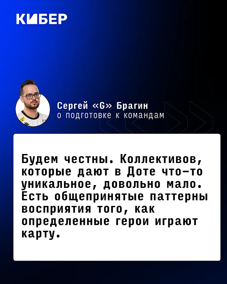 – Время, однозначно, есть, просто… Будем честны. Коллективов, которые дают в Доте что-то уникальное, довольно мало. Есть общепринятые паттерны восприятия того, как определенные герои играют карту. Если мы возьмем наши команды с квал, у них есть привычки типа паттерна по вардам или идеи игры, но из матча в матч ситуация меняется и сложно прогнозировать, мол «Если у них такой набор героев, они будут делать определенные вещи». Нестабильные коллективы выдают нестабильный перфоманс. Поэтому я не считаю, что нужно сильно фокусироваться на игре соперника, лучше больше подумать, как мы хотим играть.
