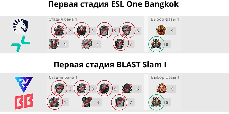 Я смотрел финалы и ESL One Bangkok, и BLAST Slam I. И на первых же картах выбил 6 из 9 совпадений: в бан улетели ТА, МК, ДК, Алхимик и Чен, а первым взяли Магнуса.