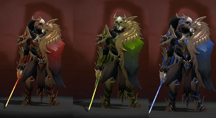 Главная фишка сета Griffin Knight на ДК – он изменяет свой цвет в зависимости от выбранного аспекта. Взяли периодический урон – позеленеете, взяли сплеш – броня будет красной, замедление – Дэвион закосплеит Артаса.