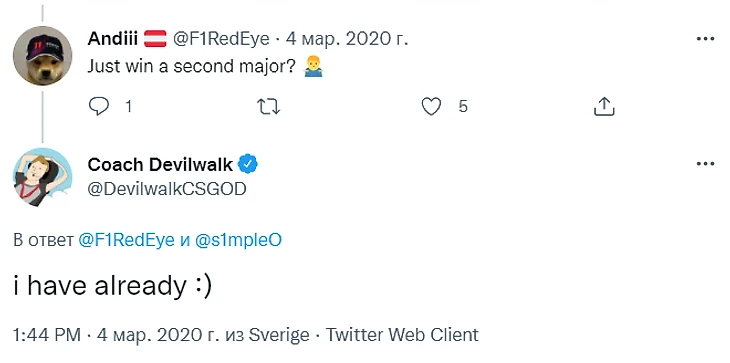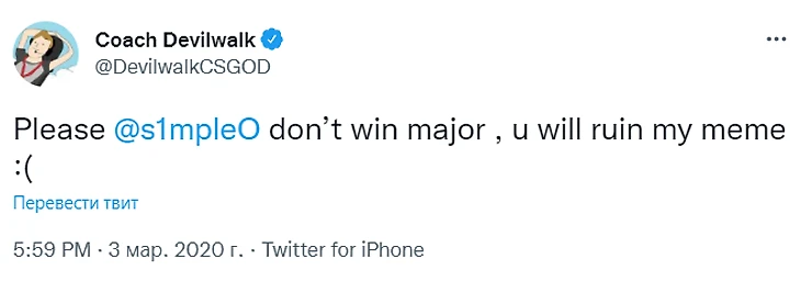 Интересный факт: Devilwalk очень известен благодаря мемному сравнению с Симплом. Пасту «Devilwalk 1 major s1mple 0 major» активно продвигал сам Джонатан. Он даже попросил Александра в твиттере не портить мем победой на мейджоре!