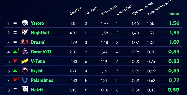 ● Антон менее чем на 0,01 обошел Крылата и Витюна, всего на 0,06 – Палантимоса. При этом он отстает от топ-3 аж на 0,24. То есть керри Winstrike, по факту, сыграл на том же уровне, что и другие тир-2 игроки в лиге.