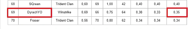 Но это были еще цветочки. Давайте откроем рейтинг квал на Инт. Что мы тут видим? Правильно, ничего мы не видим – Dyrachyo не вошел в десятки лучших. Надо лезть в подробный док и смотреть общую таблицу на 70 игроков. А там...