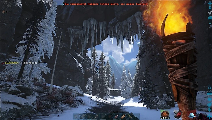 Для похода я собрала самых сильных Теризинозавров, вооружилась факелом, хилящими бутылочками, жаренным мясом и мясным рагу и вышла за порог. Температура - 40°C и ниже, кусается, с моим арсеналом жить можно, около 10 минут.
