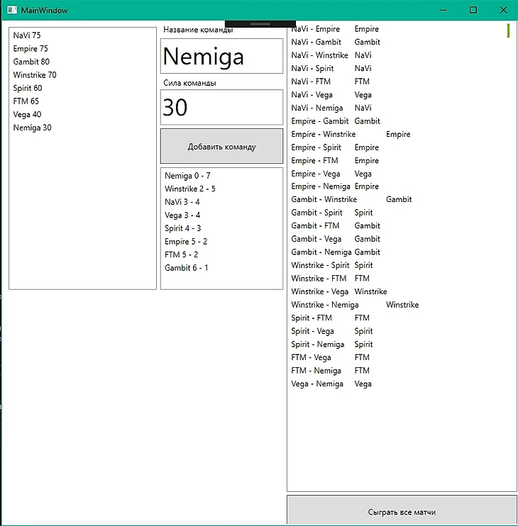 Я считаю, что квалификации настолько рандомны, что компьютер сможет предсказать исходы точнее, чем аналитики. Каждой команде я дал "силу". И вы не представляете как я мучался потом из-за данного решения. Но я не хотел всё сводить к глупым 50 на 50. У нас жестокий реальный мир. 1.5 часа я жаловался всем, что ненавижу c# и метод интервалов, но по факту я ненавидел себя из-за своих малых знаний... Дизайн программы мне делал сам Артемий Лебедев, функциональность сравнится с Apple, выдача результатов с поисковой системой Mail. Так сказать, собрал всё лучшее в единое приложение. Ну кажется всё, вот и результаты.