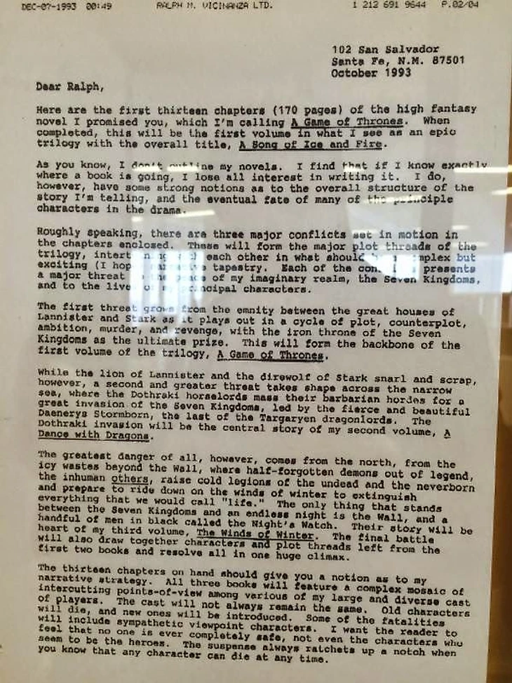 Образ настолько сильно засел в голове Джорджа, что в 1991 году он написал несколько глав. Тогда он еще и не представлял, что это вообще будет, а просто следовал образу (к методике написания Мартина мы еще вернемся). В 1992 году Джордж приостановился — работал над сериалом «Порталы» — но уже через год написал десяток глав и отправил письмо своему агенту Ральфу Вичинанце, где рассказал ему о своих планах.