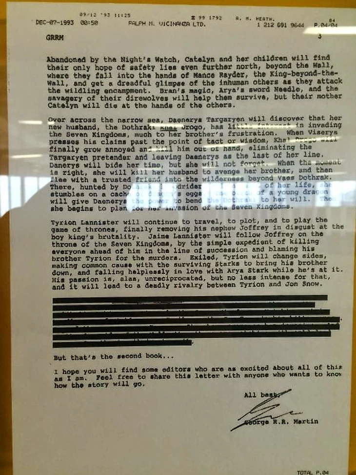 Помимо потенциальных спойлеров конца саги (их в итоге просто «заблюрили»), в письме Джордж Мартин презентует общий каркас истории своему издателю, а также вполне детально пересказывает сюжет первой книги.