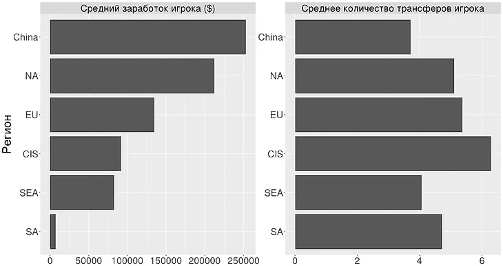 Слева вы видите распределение регионов по среднему заработку на игрока. Китай находится на первом месте. Это означает, что Китайские команды выступают на турнирах лучше других регионов. Для сравнения к каждому региону добавлено среднее количество переходов на игрока (справа).